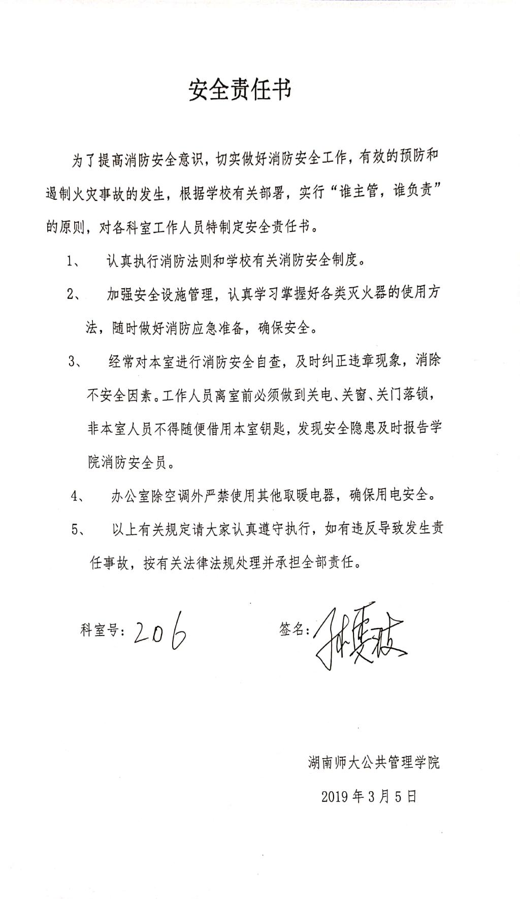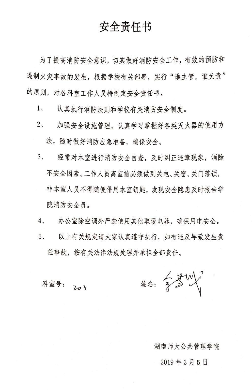 按照学院消防安全工作要求,各科室的工作人员均签订了安全责任书,承诺落实“谁主管,谁负责”的安全责任原则,自觉遵守劳动纪律和消防安全规章制度,严格执行操作规程和防火守则。