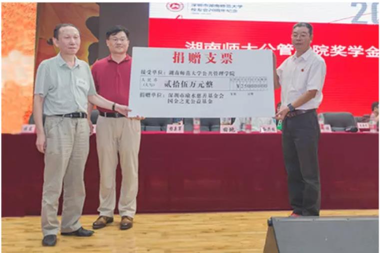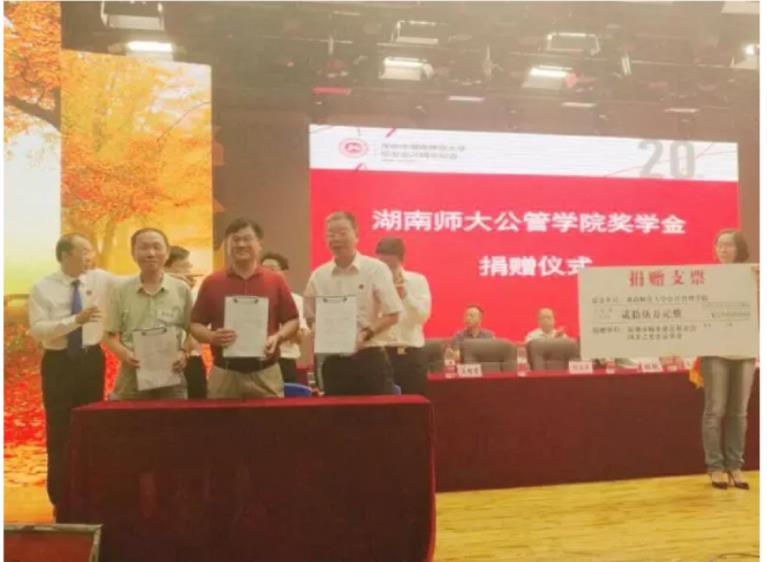 校友大会签署了《湖南师范大学公共管理学院“国金之光”优秀贫困生奖学金》的捐赠协议。捐赠方代表朱铁光,学校代表周俊武副校长,学院代表张怀承院长出席了捐赠仪式。