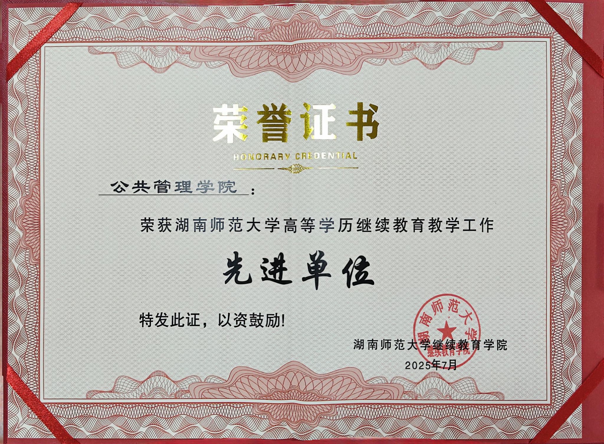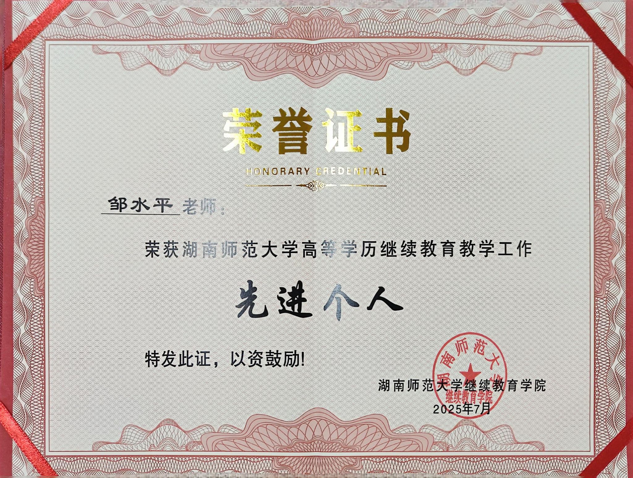 我院荣获湖南师范大学高等学历继续教育教学工作“先进单位”称号。副院长胡雪松作为2024-2025年度优秀教学单位代表发言,分享了我院的相关经验与做法。成教办副主任邹水平荣获湖南师范大学高等学历继续教育教学工作“先进个人”称号。