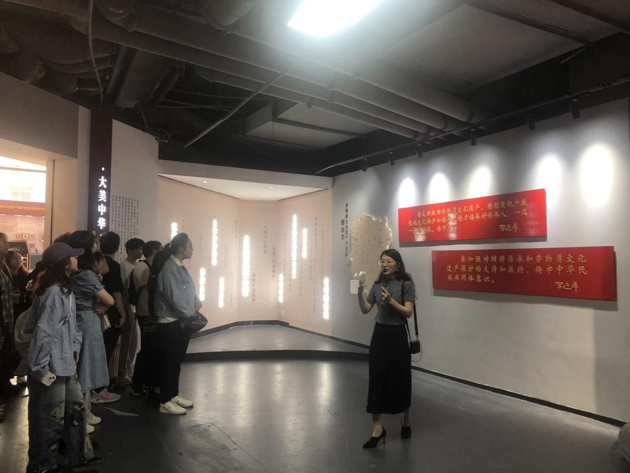 目前体验馆采取嵌入雨花非遗馆现有场馆的建设模式,在学习铸牢中华民族共同体意识的同时,王晋喜带领同学们走进非遗馆,通过身临其境的体验方式,展示非物质文化遗产的文化魅力。她提到,雨花非遗馆是全国首家民营非遗馆,通过创新非遗+旅游、非遗+教育、非遗+文创产品、非遗+市场等“非遗+”活态传承发展模式,形成“产、学、研、销”体系,打造家门口的“诗和远方”。