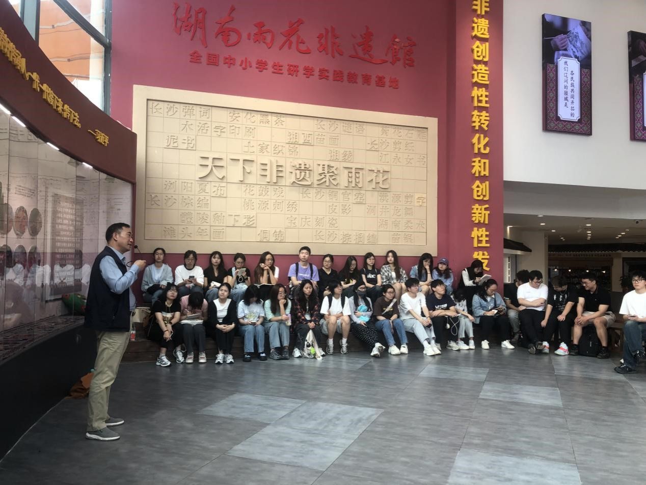 (通讯员 郭振帅 王欣)为开展湖南省普通高校教学改革项目《以“铸牢中华民族共同体意识”为导向的社会学专业课程思政“四慧一体”模式的探索与实践》,深入理解中华民族共同体的内涵,感受中华优秀传统文化与非物质文化遗产的魅力,4月26日上午,公共管理学院社会学系2021级本科生及部分研究生在王欣老师的带领下,前往湖南省铸牢中华民族共同体意识体验馆(以下简称“体验馆”)开展课程思政实践活动,将《民族社会学》的课堂搬进社会大田野。湖南省民族宗教事务委员会协调推进处一级调研员龙晔生与雨花非遗馆的讲解员王晋喜进行现场授课。