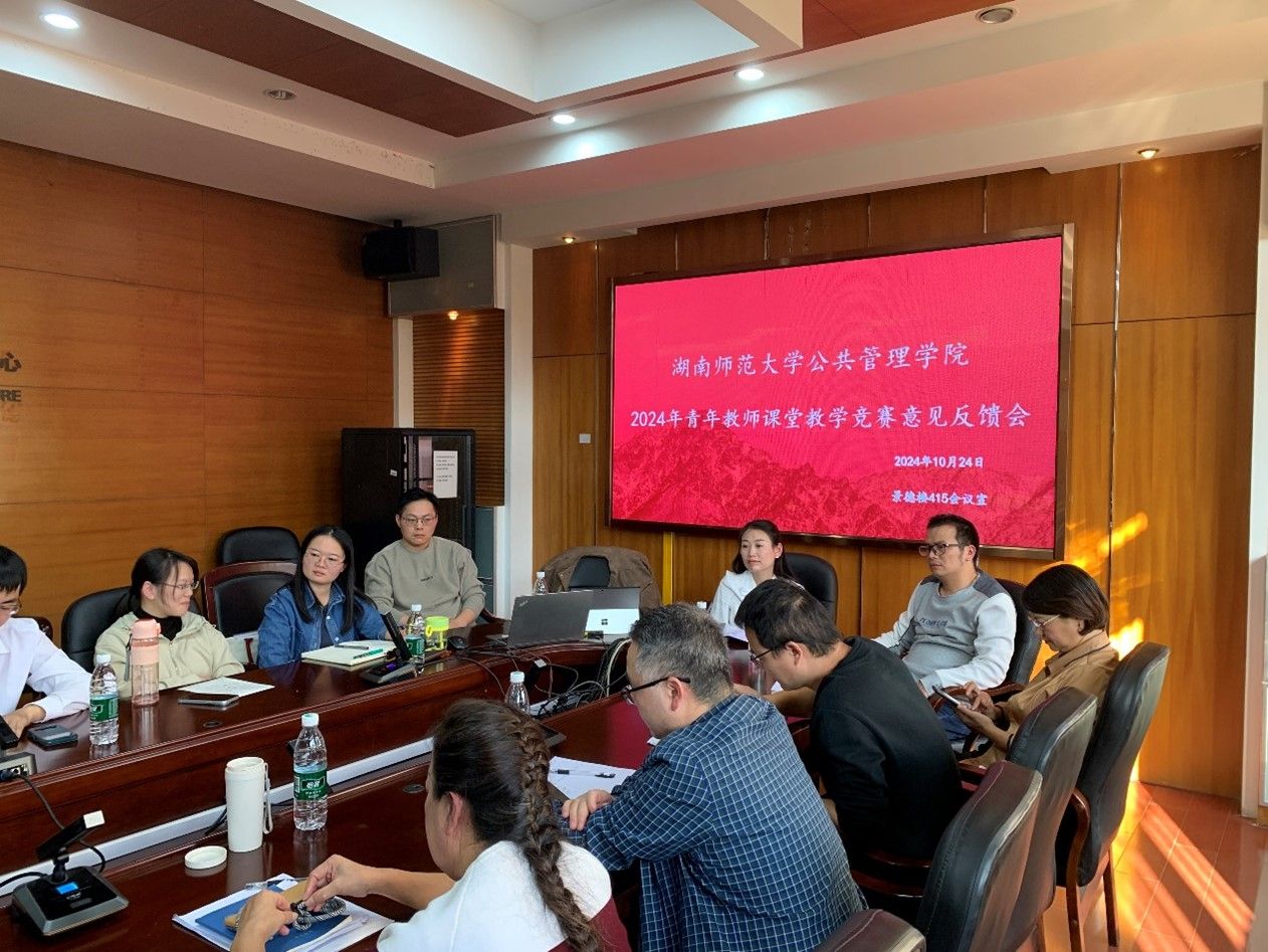 (通讯员:吕白露)2024年10月24日星期四,湖南师范大学公共管理学院于景德楼415会议室召开了2024年秋季学期青年教师课堂教学竞赛意见反馈会。党委书记余望成、教学副院长苏静、党委副书记孙雯波以及本次竞赛全体评委和参赛教师参加了会议,会议由苏静副院长主持。