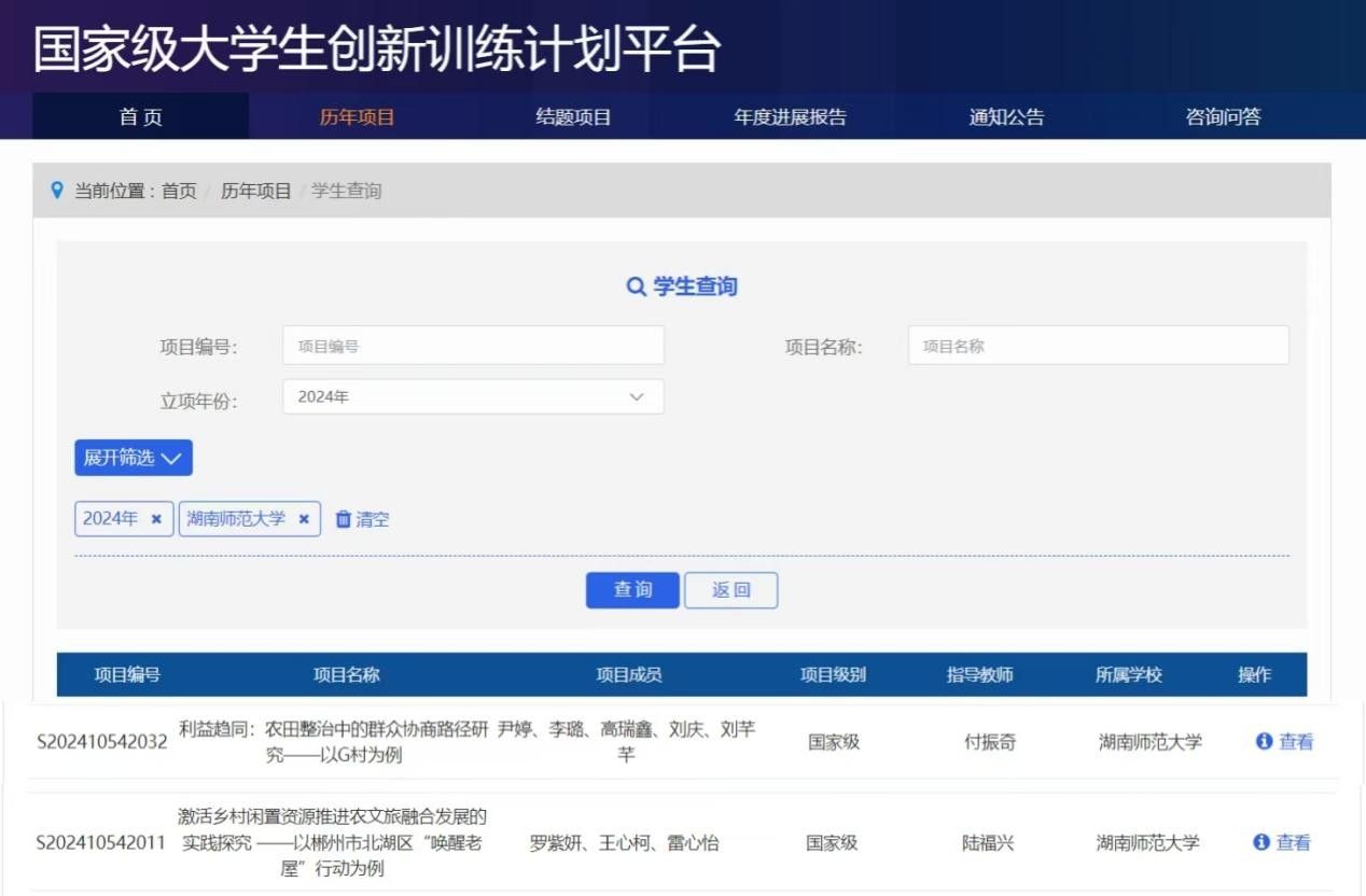 (通讯员 罗紫妍)近日,教育部高等教育司公布了2024年国家级大学生创新训练计划立项名单,公共管理学院政治学与行政管理系获两项国家级项目立项,分别为陆福兴教授指导的,由2022级行政管理专业罗紫妍同学主持的《激活乡村闲置资源推进农文旅融合发展的实践探究——以郴州市北湖区“唤醒老屋”行动为例》项目,以及付振奇副教授指导的,由2021级政治学与行政学专业尹婷同学主持的《利益趋同:农田整治中的群众协商路径研究——以G村为例》项目。