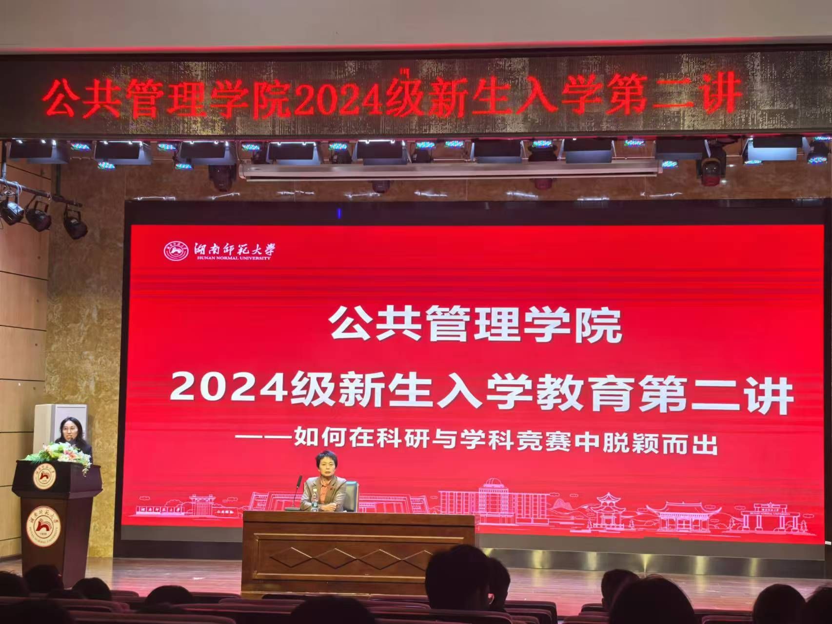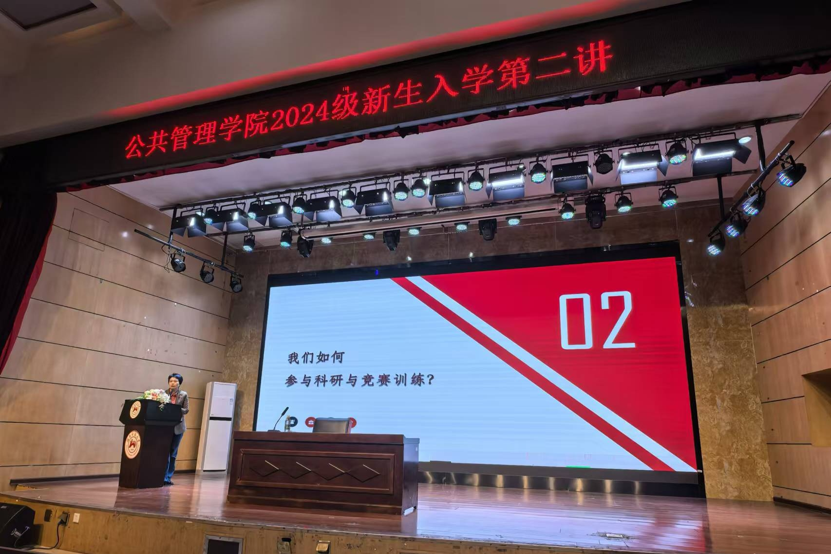 (通讯员:张逸婷 宋妍希)10月22日晚上,公共管理学院于树达楼报告厅113教室组织开展了2024级新生入学教育第二讲,邀请我院副院长苏静教授为同学们讲授“如何在科研与学科竞赛中脱颖而出”,讲座由2024级辅导员夏瑞霞主持。