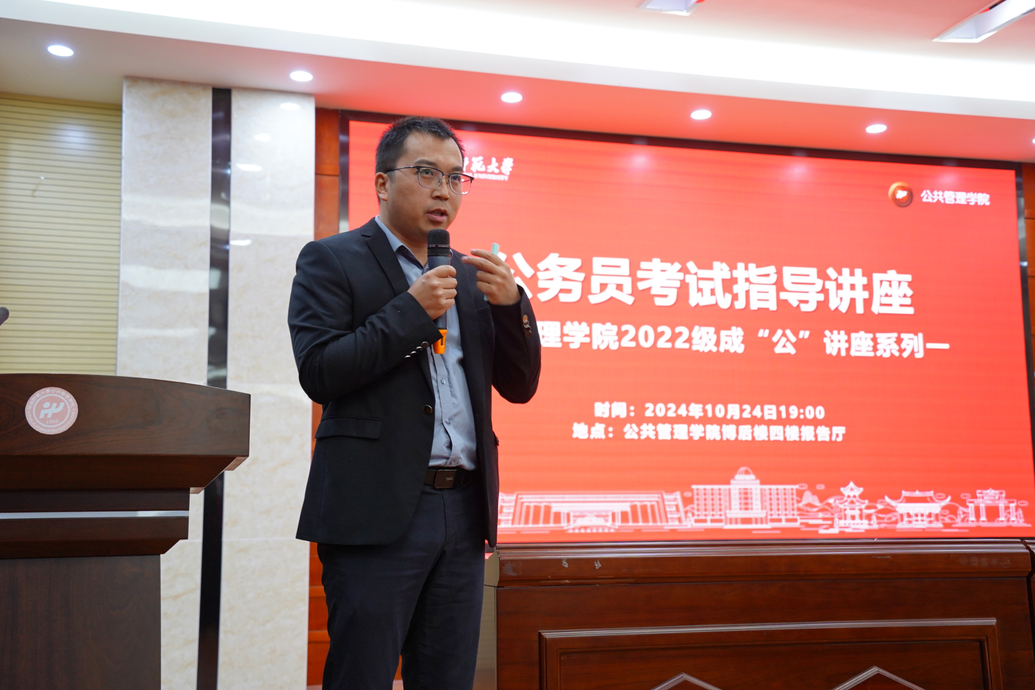 (通讯员:李明慧 游蕾 盛若水)为帮助2022级本科生了解公务员考试的相关政策、考试内容及备考策略,10月24日晚,公共管理学院(以下简称“公管院”)2022级于博后楼四楼报告厅开展成“公”系列讲座之公务员考试指导。此次讲座邀请公考行业资深讲师刘云飞主讲,来自公管院、马克思主义学院等学院的100余名同学参加了活动。讲座由公管院2022级年级长谭郭行主持。
