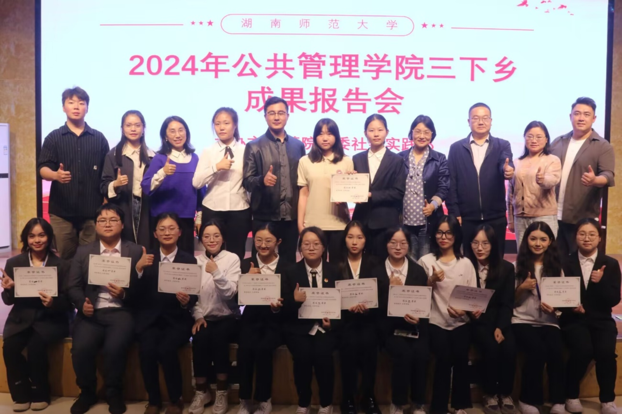 (通讯员:张佩研 李泽晟 留晨涵)为更好地总结“三下乡”活动的成果与经验、深化青年大学生对乡村振兴和文化发展的认识,11月7日晚,公共管理学院(以下简称“公管院”)团委社会实践部于桃花坪校区树达楼113报告厅开展“三下乡”成果汇报会。此次汇报会由22级哲学班聂晨晨主持,公管院党委副书记孙雯波,“三下乡”队伍指导老师谭卫华、瞿理铜、冯帅帅,学工办主任林哲旭,2023级辅导员兰绍娴、2024级辅导员夏瑞霞,团委负责老师申峰铭,以及校团委、新闻与传播学院、马克思主义学院嘉宾受邀参加。