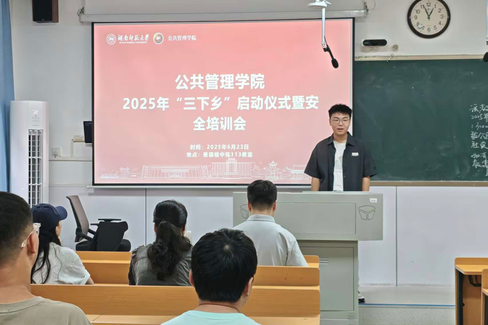 (通讯员 陈珏嵘 刘晨昊 谭欣雨)6月23日下午,为了更好推进2025年暑期“三下乡”社会实践活动的开展,进一步加强安全管理,提高参与学生的安全意识和个人素质,公共管理学院(以下简称“公管院”)团委社会实践部(以下简称“社实部”)在景德楼中栋113教室举行三下乡启动仪式暨安全培训会。此次会议由社实部刘晨昊主持。公管院团委负责人申峰铭受邀参加,三下乡各实践队队长及代表参与此次会议。