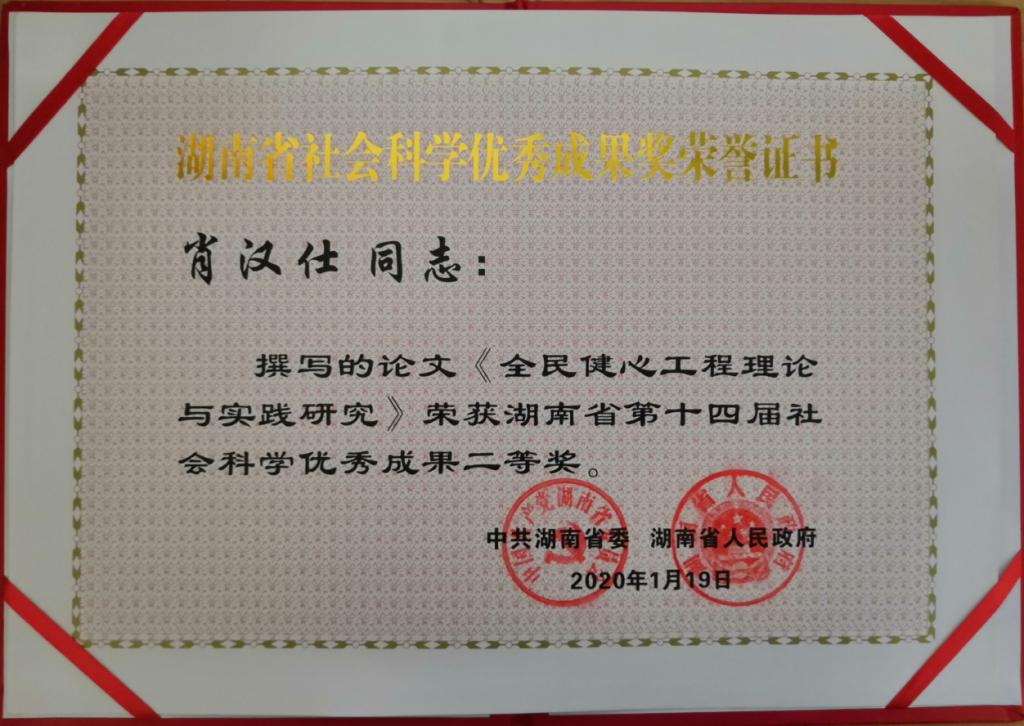 湖南师范大学公共管理学院博士生导师、社会治理与社会政策研究所所长、中国全民健心网首席专家、健心学堂创建者、心理学二级教授肖汉仕的“全民健心工程理论与实践研究”荣获中共湖南省委、湖南省人民政府颁发的湖南省社会科学优秀成果二等奖。