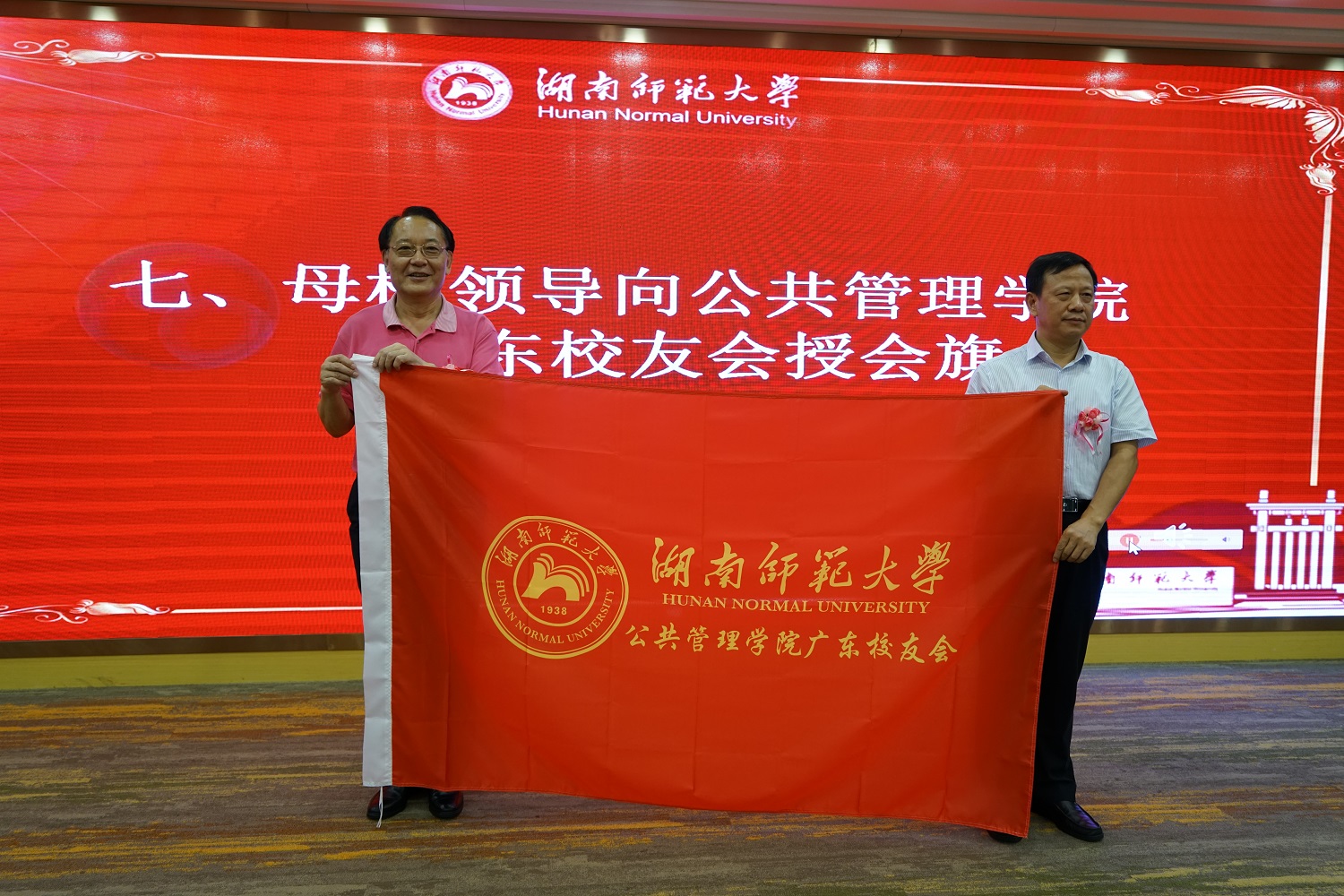 湖南师范大学原校长、校友总会名誉会长刘湘溶、湖南师范大学副校长周俊武、校友总会秘书长杨玲、公共管理学院书记余望成以及公共管理学院到会的历任领导班子成员为当选的理事会成员颁发聘书;校友总会名誉会长刘湘溶为公管院广东校友会授会旗。