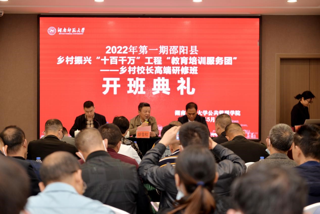2022年5月18日上午8:30,2022年第一期邵阳县乡村振兴“十百千万”工程---乡村校长高端研修班在东方和庭酒店三楼会议室举行了开学典礼。我院副院长胡雪松、邵阳县教师发展中心主任刘刚超、邵阳县教育局唐琦主任出席了典礼。
