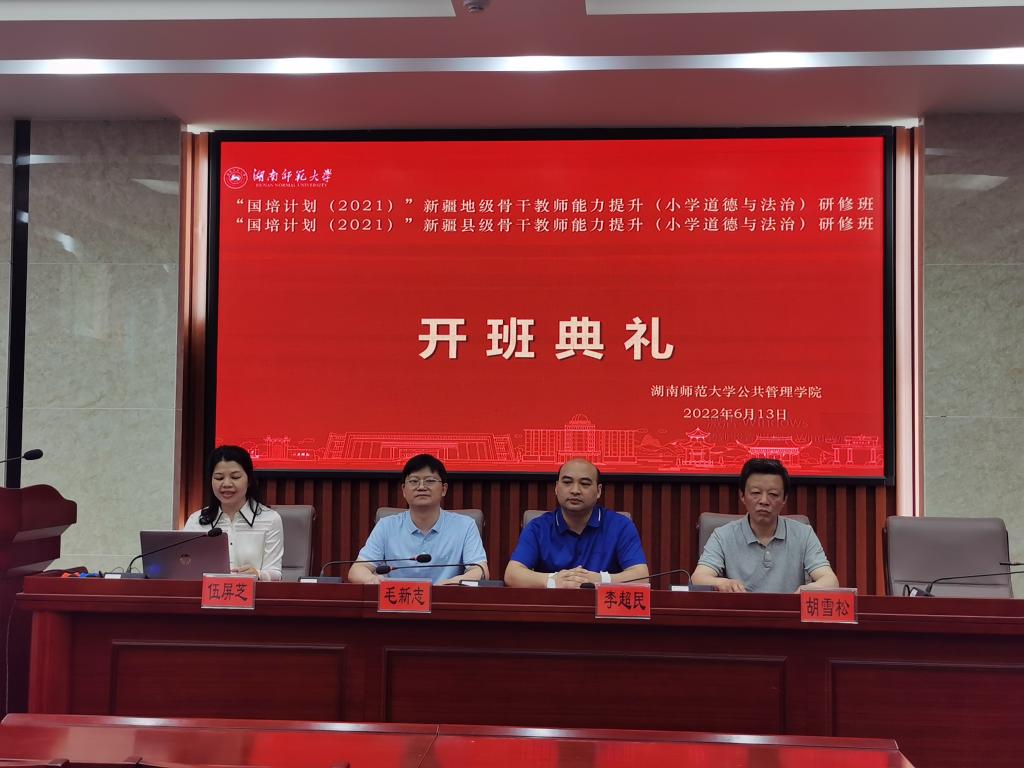 2022年6月13日上午9:30,“国培计划(2021)”新疆地级小学道德与法治骨干教师能力提升研修班与县级小学道德与法治骨干教师能力提升研修班在奥鹏师训宝研修平台举行线上开班典礼。我院院长毛新志、副院长胡雪松、李超民、政治学系副主任伍屏芝出席了典礼。典礼由伍屏芝主持。