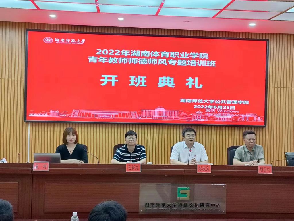 2022年6月25日上午8:30,湖南体育职业学院青年教师师德师风专题培训班在我院学术报告厅举行开班典礼。湖南体育职业学院常务副院长、我校校友彭庆文、湖南师范大学公共管理学院院长毛新志、副院长胡雪松出席了典礼。典礼由学院培训中心主任王群主持。