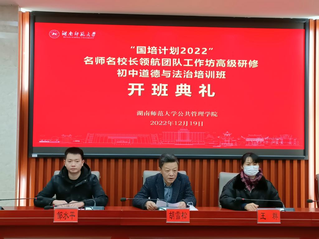 12月19日上午8:30,由我院承办的“国培计划2022”—名师名校长领航团队工作坊高级研修·初中道德与法治培训班(C215)线上开班典礼在博后楼三楼报告厅顺利举行。我院副院长胡雪松和培训中心主任王群现场出席本次典礼,李超民副院长线上出席。典礼由班主任邹水平老师主持。
