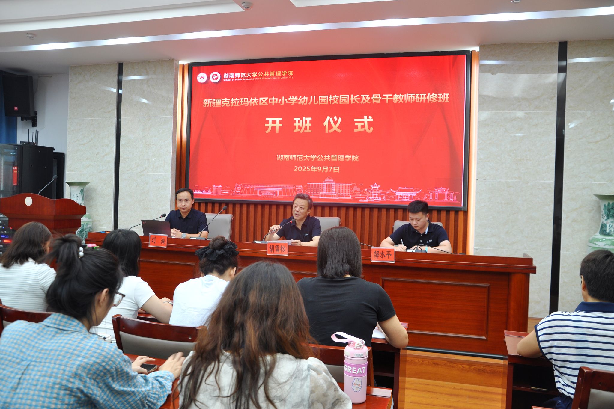 9月7日上午8:30,由新疆克拉玛依市克拉玛依区教育局主办、沙湾市和塔城市教育局协办、我院承办的2025年克拉玛依区中小学幼儿园校园长领导力研修班及2025年克拉玛依区中小学幼儿园骨干人才研修班(第二期)开班典礼在我院博后楼3楼报告厅顺利举行。我院副院长胡雪松、培训中心主任邹水平出席典礼,典礼由我院行政办副主任刘操主持。