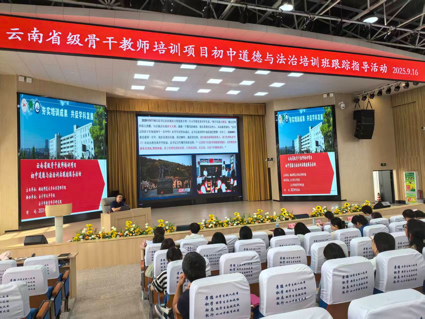 为进一步提升湖南省新时代基础教育名师培养对象的教育教学能力与辐射引领能力,9月14至20日,我院组织湖南省小学道德与法治名师培养对象王新菲、初中道德与法治名师培养对象马明、高中政治名师培养对象肖华根、小学道德与法治卓越教师培养对象沈妍琼赴云南开展国培项目训后跟踪指导活动,并协同开展名师基地培养活动。我院副院长胡雪松、行政办副主任刘操及成教办干事周晓洪参加了此次活动。