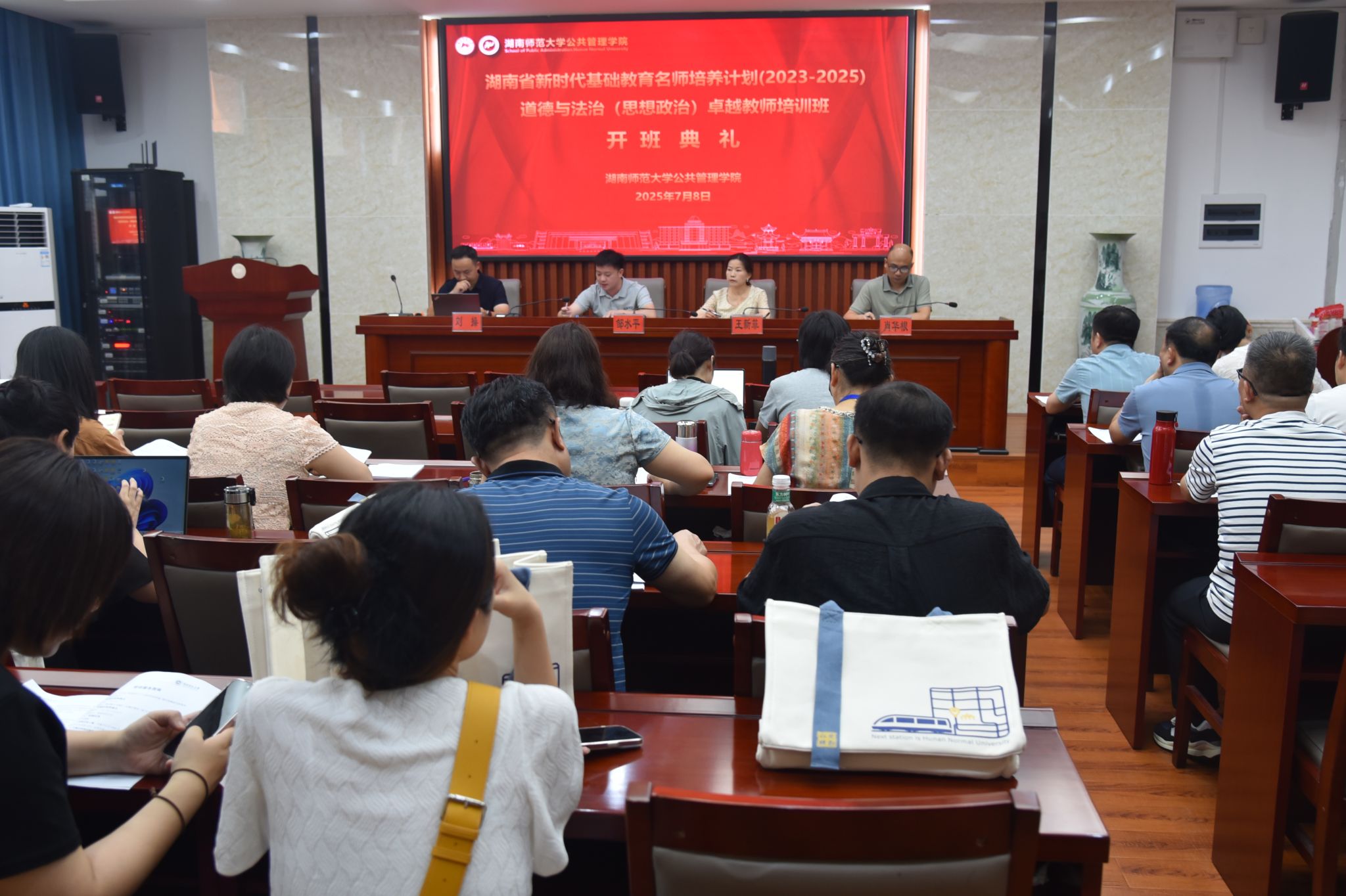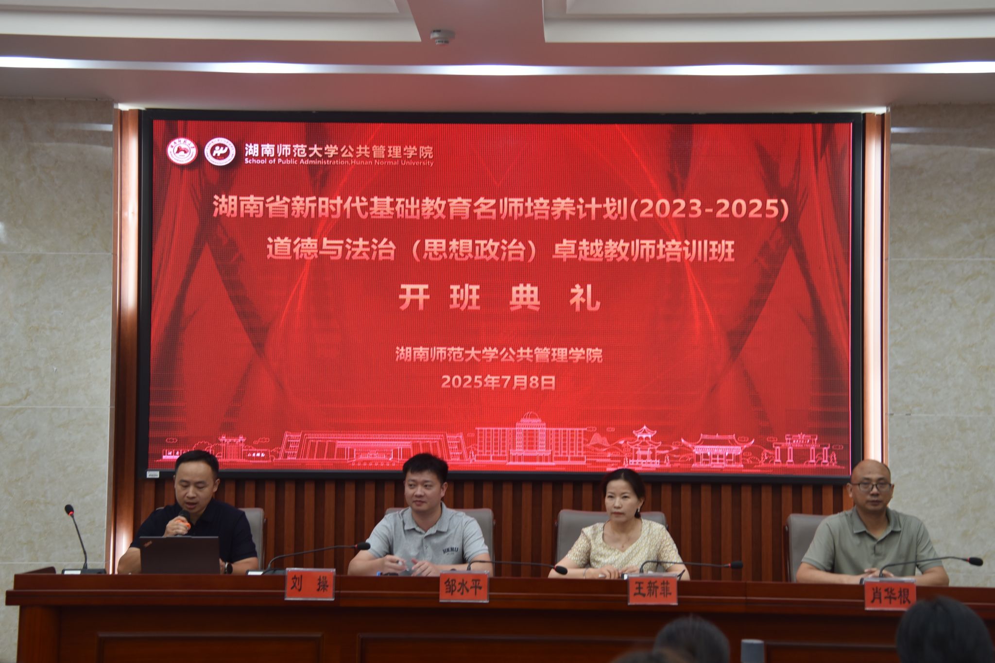 2025年7月8日上午8:30,湖南省新时代基础教育名师培养计划(2023-2025)道德与法治(思想政治)卓越教师培训班(第四期)开班典礼在我院3楼报告厅举行。岳阳市岳阳楼区东升小学党总支书记、湖南省小学道德与法治名师培养对象王新菲,郴州市第一中学(南校区)校长、湖南省高中政治名师培养对象肖华根,湖南师范大学公共管理学院培训中心主任、道德与法治(思想政治)名师培养基地秘书邹水平出席了开班典礼。典礼由我院行政办副主任、培训班班主任刘操主持。